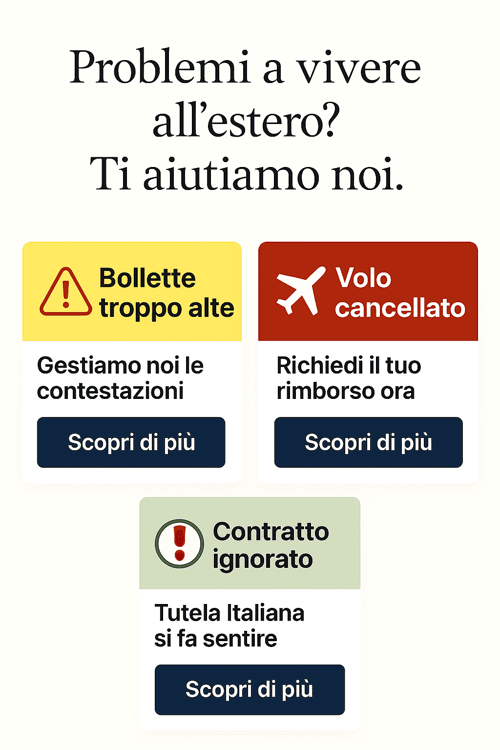 Sei all’estero e hai problemi con bollette, contratti o disservizi in Italia? Un volo cancellato, un pacco non arrivato o un rimborso bloccato? Con soli €41,50/anno, Tutel@Italiana ti offre supporto pratico e personalizzato per risolvere pratiche burocratiche in Italia, ovunque tu sia nel mondo.